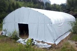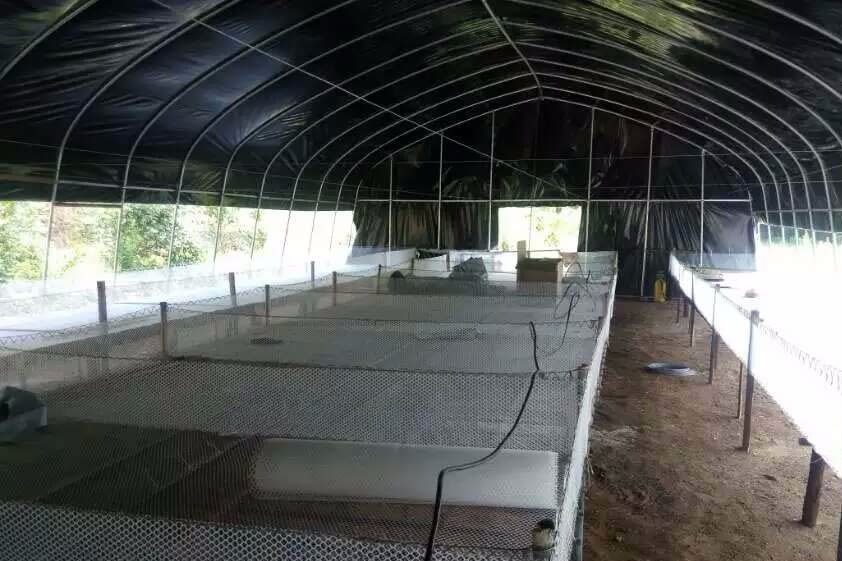 本大棚熱鍍鋅鋼管骨架,采用厚度15絲的黑白膜覆蓋,有效阻止光線進入大棚,兩側(cè)卷膜通風(fēng),適用于菌菇種植。