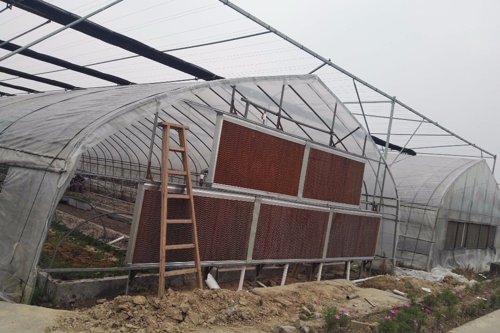 本大棚配備了風(fēng)機(jī)濕簾降溫系統(tǒng),在大棚的一端安裝風(fēng)機(jī),另一端安裝濕簾,在風(fēng)機(jī)的作用下,大棚外部的空氣進(jìn)入濕簾,穿過濕簾內(nèi)部自上而下的水流時空氣的溫度降低,從而使大棚內(nèi)部的溫度降低。