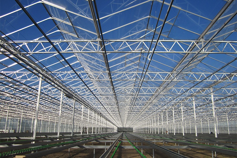 文洛式玻璃溫室為一跨三尖頂、雙坡面小屋頂桁架結(jié)構(gòu)、多雨槽、具有美觀(guān)、吊掛能力強(qiáng)、透光性好、空間大、機(jī)械性能強(qiáng)等優(yōu)點(diǎn)。