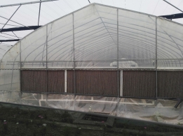 本大棚配備了風(fēng)機(jī)濕簾降溫系統(tǒng),在大棚的一端安裝風(fēng)機(jī),另一端安裝濕簾,在風(fēng)機(jī)的作用下,大棚外部的空氣進(jìn)入濕簾,穿過濕簾內(nèi)部自上而下的水流時空氣的溫度降低,從而使大棚內(nèi)部的溫度降低。